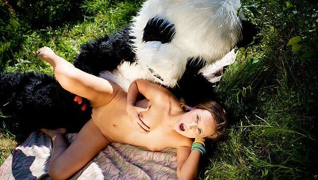 Oh no, somebody caught this busty teenage in the forest, tied her up and left her all alone like that. Who knows what could have happen to the poor thing, but suddenly a big panda bear appeared and rescued the pretty girl. A hero deserves some award, right? Something like a fun fuck would be just perfect, especially if the panda's horny as hell. His huge strapon dildo made the girl aroused too, and she got down to suck it. Then she let the panda bang her with that brutal dildo. Oh, this hot sex play is a must-see!