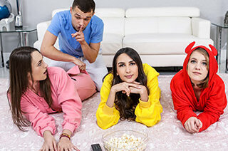 Natalia Nix is excited to have her two best friends Dani Damzel and Dakota Burns over for a movie night slumber party, so they get their onesies on, their popcorn ready and lay in the living room to watch a movie. Little did they know that Natalia’s stepbrother Johnny had placed a secret camera and is challenging himself to turn all three girls' attention on to his huge dick.