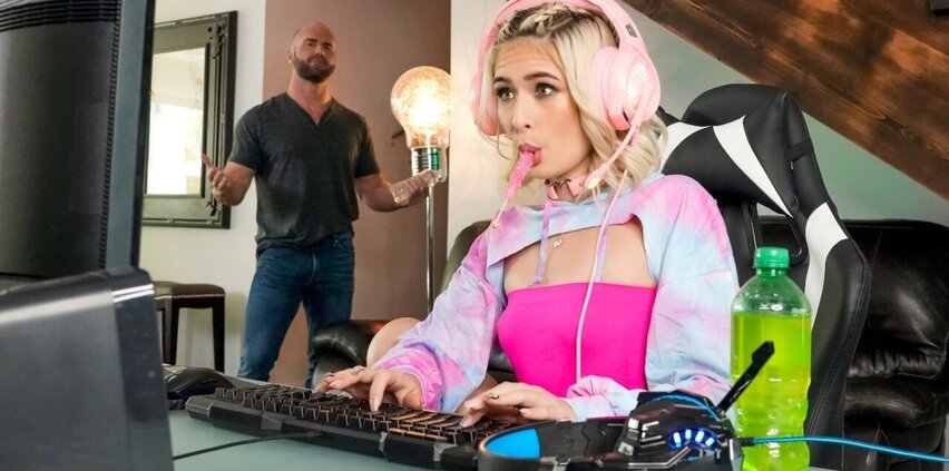 Gamer babe Jessie Saint's wi-fi keeps cutting out during an important game, so she sneaks on to her roommate Danny Steele's cute setup instead. The blonde finds Danny's password--"RoommatesTightSnatch69"--written down and hacks in. When Danny prefers to get online, Jessie says she'll do anything if he'll let her maintain gaming, so he asks for a taste of that tight snatch! Jessie keeps gaming as Danny licks her muff and even as she blows his rod, but the only thing that can create her log off is the feel of that substantial penis nailing her in doggystyle! This ahegao-faced hottie will be playing with Danny's joystick a lot more.