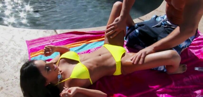 Watch Trinity St. Clair flaunt her curves in a sexy neon green bikini as she pleasures a big cock with her mouth before getting pounded at the poolside. Don't miss this steamy scene with a stunning brunette beauty.